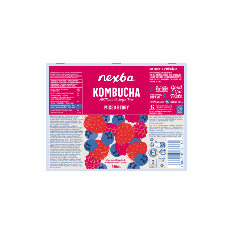 Ingredient Declaration | Sparkling water; naturally fermented kombucha (purified water, oolong tea,sugar, kombucha cultures), natural sweeteners (erythritol, steviol glycosides);acidity regulator (citric acid); natural flavours (strawberry, raspberry, cranberry),live cultures (Bacillus coagulans). |