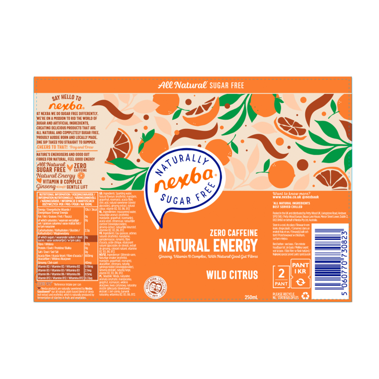 | Ingredient Declaration | Sparkling Water, natural flavours (erythritol*, mandarin, grapefruit, rosemary), acacia fibre, citric acid, natural sweetener (steviol glycosides), Ginseng extract, natural colour, Vitamin B2, B3, B6, B12. |