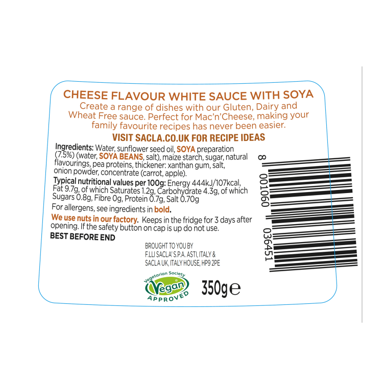 | Ingredient Declaration | Water, sunflower seed oil, SOYA preperation 7.5% (water, SOYABEANS, salt). modified maize starch, sugar, natural flavourings, pea proteins, thickener (xanthan gum). salt, onion powder, concentrate (carrot, apple). |