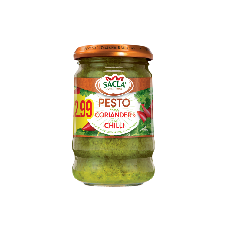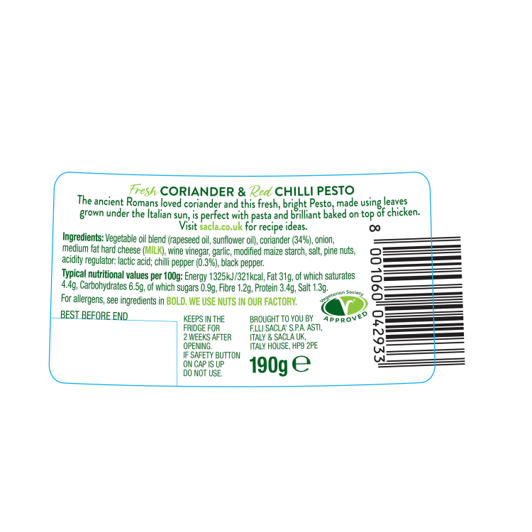 | Ingredient Declaration | Vegetable oil blend (rapeseed oil, sunflower oil), coriander (34%), onion, medium fat hard cheese (MILK), wine vinegar, garlic, modified maize starch, salt, pine nuts, acidity regulator: lactic acid, chilli pepper (0.3%), black pepper. |