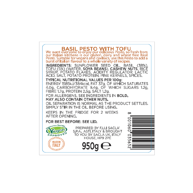 | Ingredient Declaration | Sunflower seed oil, Basil 38%, Tofu 5% (water, SOYABEAN), CASHEW NUTS, Rice syrup, Potato flakes, Acidity regulator: Lactic acid, Salt, Potato protein, Pine kernels, Spices |