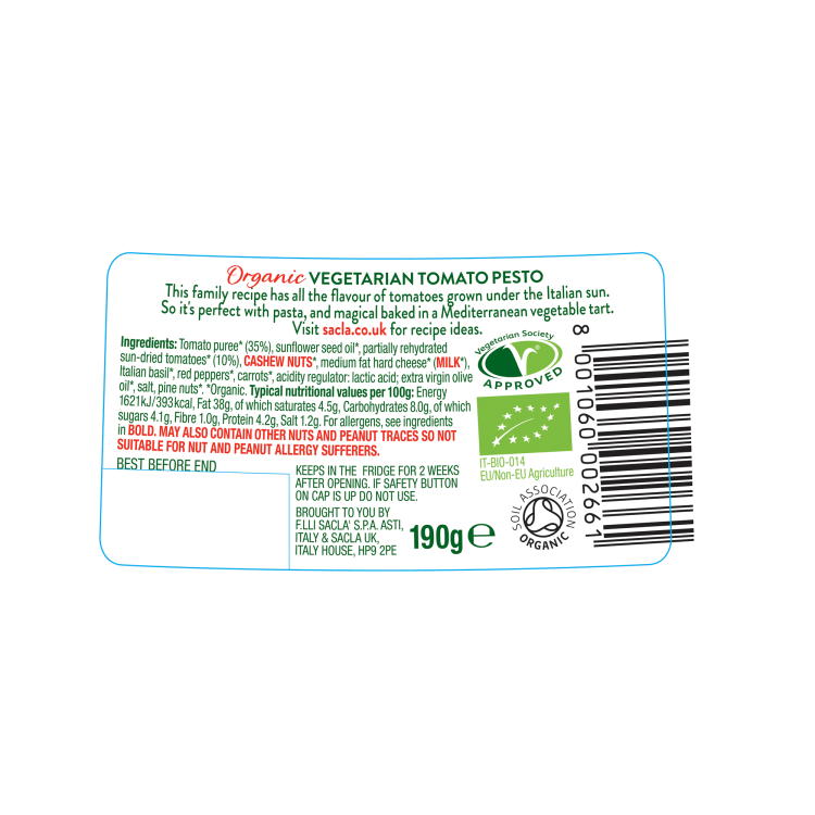 | Ingredient Declaration | Tomato puree 35%, sunflower seed oil, partially rehydrated sundried tomatoes 10%, CASHEW NUTS, Medium fat hard cheese (MILK). Italian basil, red peppers, carrots, acidity regulator (lactic acid). extra virgin olive oil, salt, pine kernels. |