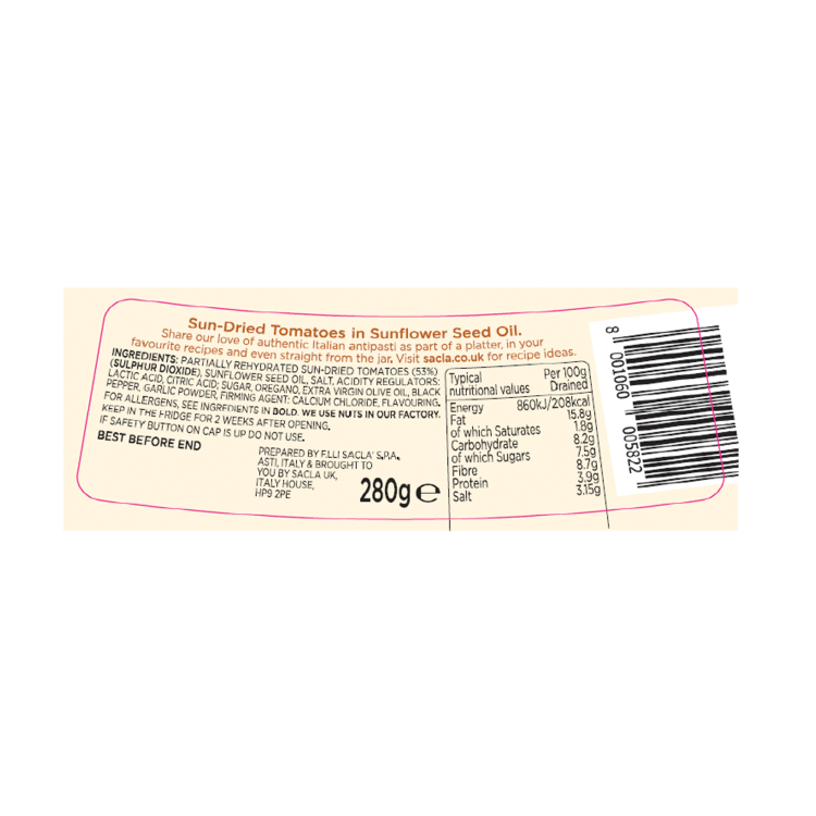 | Ingredient Declaration | Partially rehydr. SUN DRIED TOMATOES (53%)(SULPHUR DIOXIDE), Sun dried tomatoes, Salt, Acidity regulator:citric acid (E330), Antioxidants:Ascorbic acid (E300), residual sulphur dioxide (E220) (<100ppm), SUNFLOWER SEED OIL, ACIDITY REGULATORS: Lactic acid (E270), Citric acid (E330), SUGAR, OREGANO, EXTRA VIRGIN OLIVE OIL, BLACK PEPPER, GARLIC POWDER, FIRMING AGENT: CALCIUM CHLORIDE (E509), FLAVOURING |