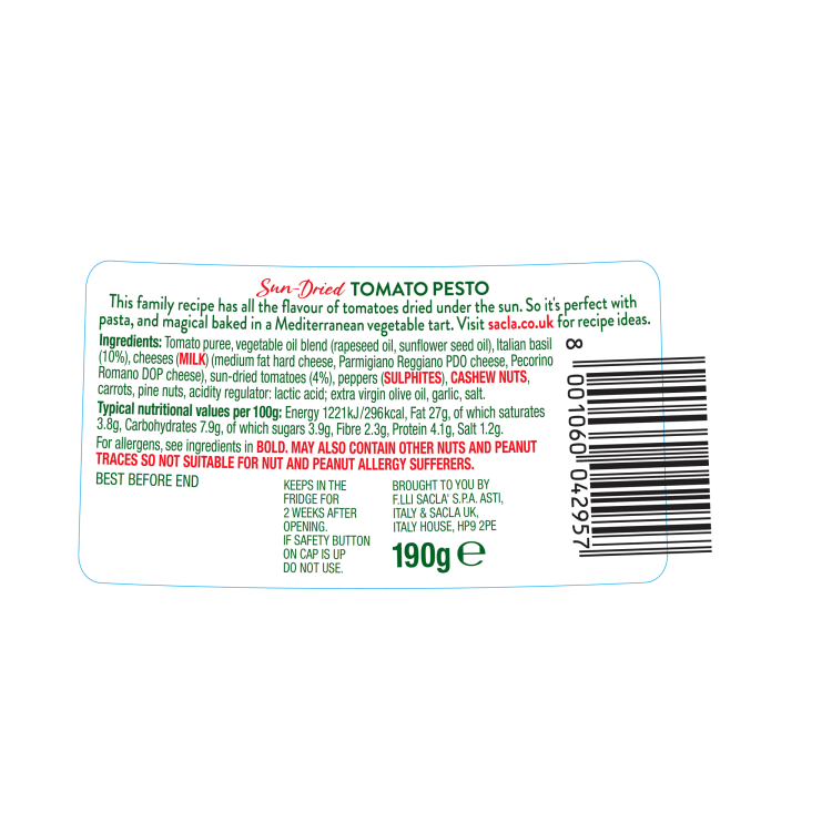 | Ingredient Declaration | Tomato puree, vegetable oil blend (rapeseed oil, sunflower oil), Italian basil (10%), cheeses (MILK) (medium fat hard cheese, Parmigiano Reggiano PDO cheese, Pecorino Romano DOP cheese), sun-dried tomatoes (4%), peppers (SULPHITES), CASHEW NUTS, carrots, pine nuts, acidity regulator: lactic acid, extra virgin olive oil, garlic, salt. |