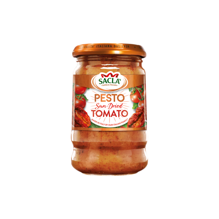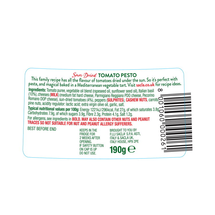 | Ingredient Declaration | Tomato puree, vegetable oil blend (rapeseed oil, sunflower oil), Italian basil (10%), cheeses (MILK) (medium fat hard cheese, Parmigiano Reggiano PDO cheese, Pecorino Romano DOP cheese), sun-dried tomatoes (4%), peppers (SULPHITES), CASHEW NUTS, carrots, pine nuts, acidity regulator: lactic acid, extra virgin olive oil, garlic, salt. |