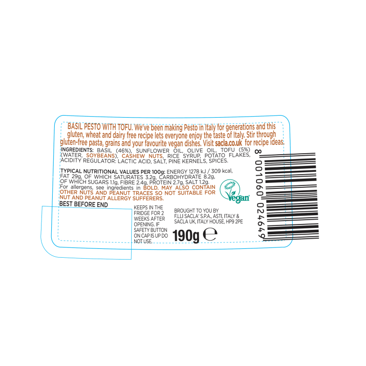 | Ingredient Declaration | Basil (52%), sunflower oil, CASHEW NUTS, rice syrup, potato flakes, olive oil, salt, acidity regulator: lactic acid, natural flavouring, pine nuts, spices. |