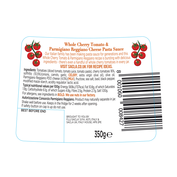 | Ingredient Declaration | Tomatoes (diced tomato, tomato juice, tomato paste), cherry tomatoes (16%), soffritto (10.5%)(onions, carrot, garlic, CELERY, extra virgin olive oil), olive oil, Parmigiano Reggiano PDO cheese (4.5%)(MILK), fructose, sea salt, basil, black pepper, modified maize starch, acidity regulator: lactic acid |