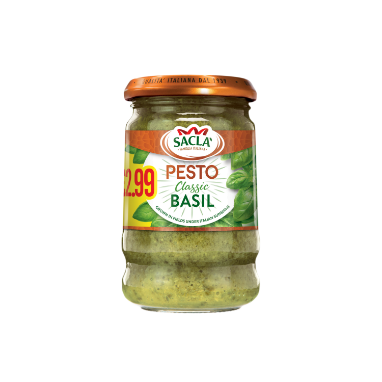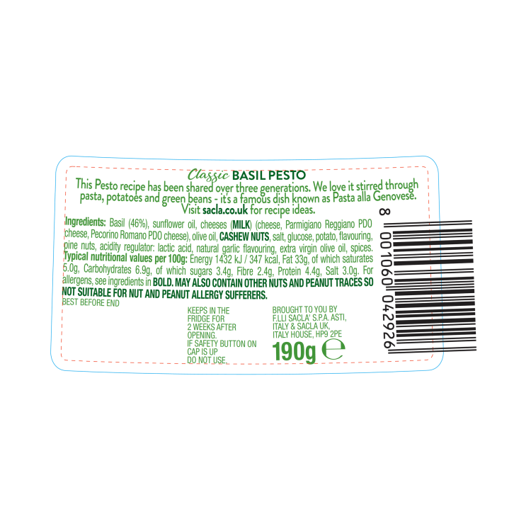 | Ingredient Declaration | Basil (46%), sunflower oil, cheeses (MILK) (cheese, Parmigiano Reggiano PDO cheese, Recorino Romano PDO cheese), olive oil, CASHEW NUTS, salt, glucose, potato, flavouring, pine nuts, acidity regulator: lactic acid, natural garlic flavouring, extra virgin olive oil, spices. |