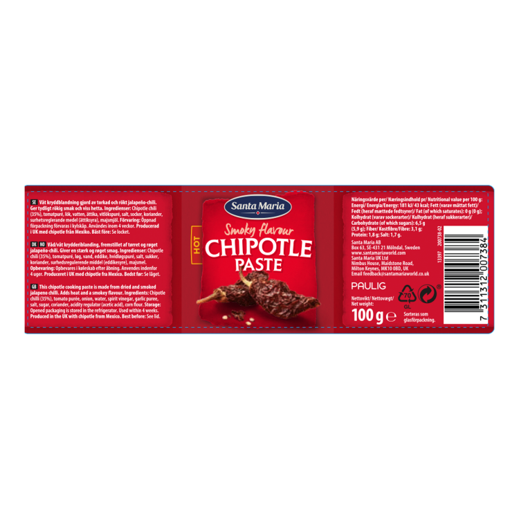 | Ingredient Declaration | Chipotle Chilli(35%),tomato puree,onion,water,spirit vinegar,garlic puree,salt,sugar,coriander,acidity regulator (acetic acid),corn flour. |