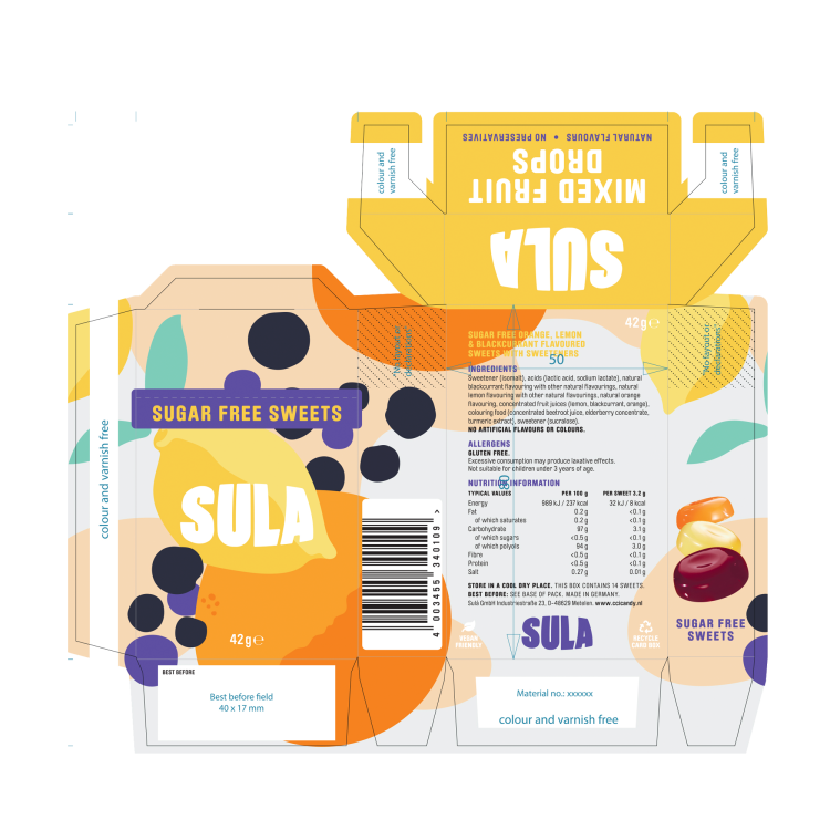 | Ingredient Declaration | Sweetener (isomalt), acids (lactic acid, sodium lactate), natural blackcurrant flavour with other natural flavours, plant extracts (elderberry juice concentrate, beetroot juice concentrate, curcuma extract), natural lemon flavour with other natural flavours, natural orange flavour, orange juice concentrate (0,06%)*, blackcurrant juice concentrate (0,06%)*, lemon juice concentrate (0,06%)*, sweetener (sucralose). *approx. 0,2% juice concentrate, equates 1% fruit juice |