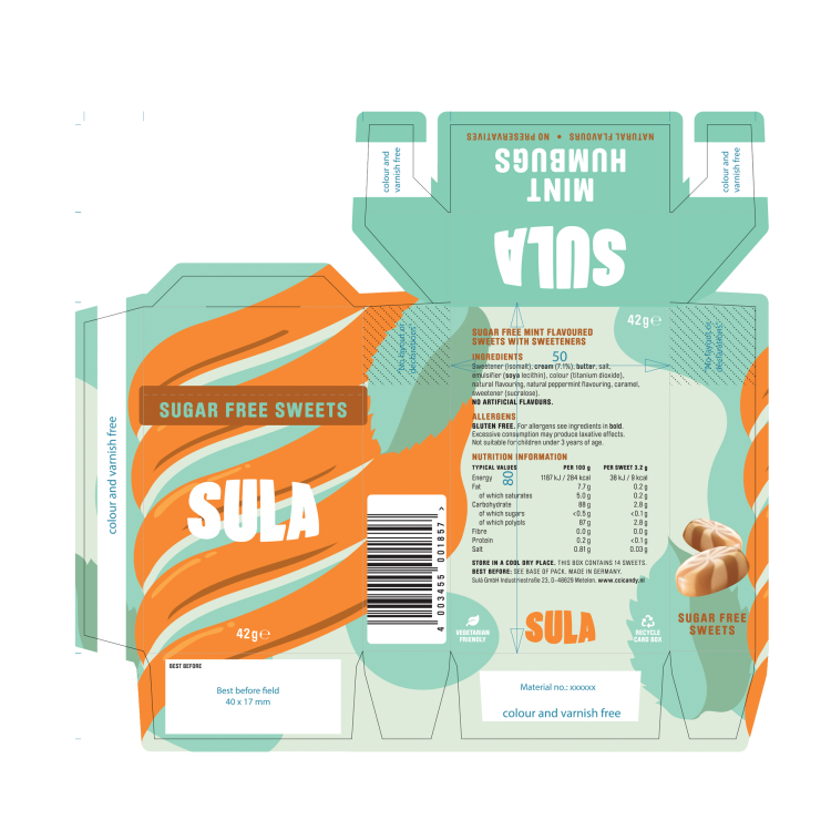 | Ingredient Declaration | Sweetener (isomalt), CREAM (7,2%), BUTTER (6,1%), salt, emulsifier (SOYA lecithin), natural peppermint flavour (0,4%), natural flavour, colour (plain caramel), caramel, sweetener (sucralose). |