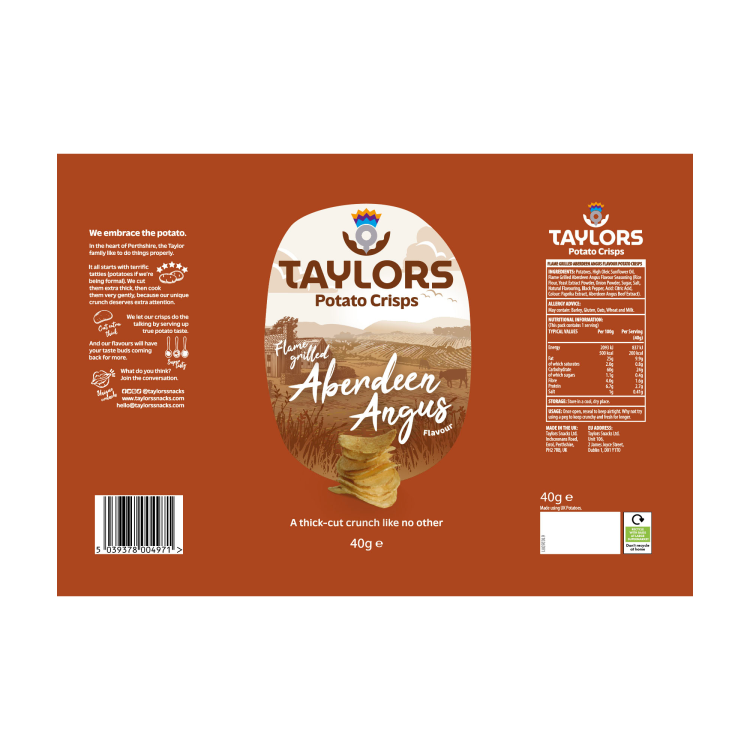 | Ingredient Declaration | Potatoes, High Oleic Sunflower Oil, Flame Grilled Aberdeen Angus Flavour Seasoning (Rice Flour, Yeast Extract Powder, Onion Powder, Sugar, Salt, Natural Flavouring, Black Pepper, Acid: Citric Acid, Colour: Paprika Extract, Aberdeen Angus Beef Extract). |