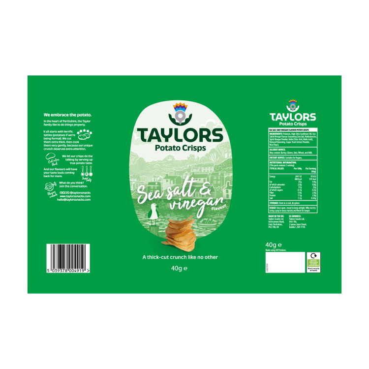 | Ingredient Declaration | Potatoes, High Oleic Sunflower Oil, Salt & Vinegar Flavour Seasoning (Sea Salt, Maltodextrin, Spirit Vinegar Powder, Acid (Citric Acid, Malic Acid), Natural Flavouring, Sugar, Yeast Extract Powder, Rice Flour). |
