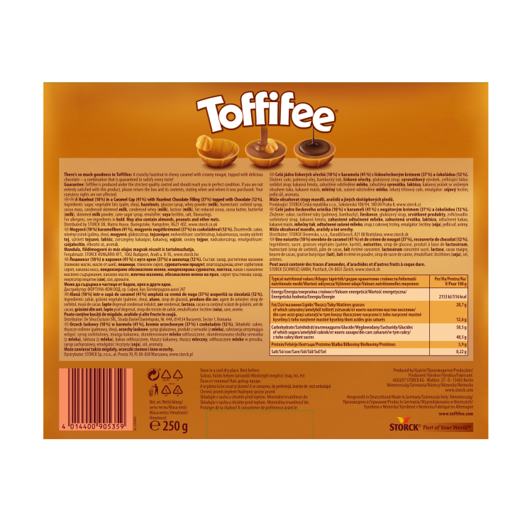| Ingredient Declaration | Sugar, Vegetable Fats (palm,shea), HAZELNUTS, Glucose Syrup, Skimmed MILK Powder, Humectant: Sorbitol Syrup, Cocoa Mass, Condensed skimmed MILK, Condensed whey (MILK), Lactose (MILK), Fat Reduced Cocoa, Cocoa Butter, Butterfat (MILK), Partially inverted refiners syrup, whey powder (MILK), Emulsifier: SOYA lecithin, Salt, Flavouring. |