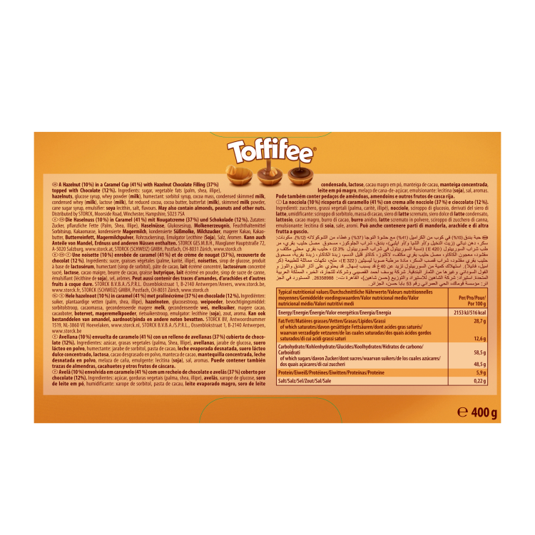| Ingredient Declaration | Sugar, Vegetable Fats (palm,shea), HAZELNUTS, Glucose Syrup, Skimmed MILK Powder, Humectant: Sorbitol Syrup, Cocoa Mass, Condensed skimmed MILK, Condensed whey (MILK), Lactose (MILK), Fat Reduced Cocoa, Cocoa Butter, Butterfat (MILK), Partially inverted refiners syrup, whey powder (MILK), Emulsifier: SOYA lecithin, Salt, Flavouring. |