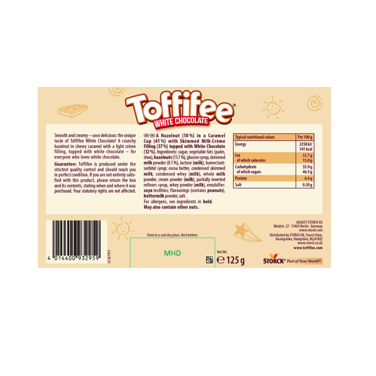 | Ingredient Declaration | Sugar, vegetable fats (palm, shea). HAZELNUTS (13,1%). glucose syrup, skimmed MILK powder (8,1%). lactose (MILK). humectant (sorbitol syrup) E420, cocoa butter, condensed skimmed MILK, condensed whey (MILK). whole MILK powder, cream powder (MILK). Partially inverted refiners syrup, whey powder (MILK). Emulsifier (SOYA lecithins). flavouring (contains PEANUTS). BUTTERMILK powder, salt. |