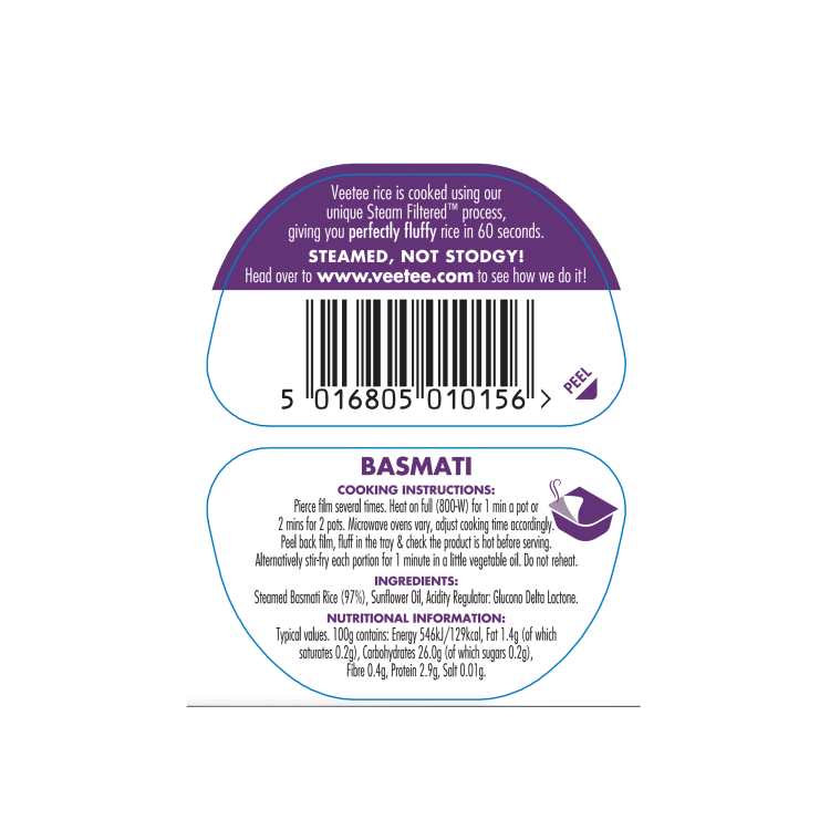 | Ingredient Declaration | Steamed Basmati Rice (97%), Sunflower Oil, Acidity Regulator: Glucono Delta Lactone |