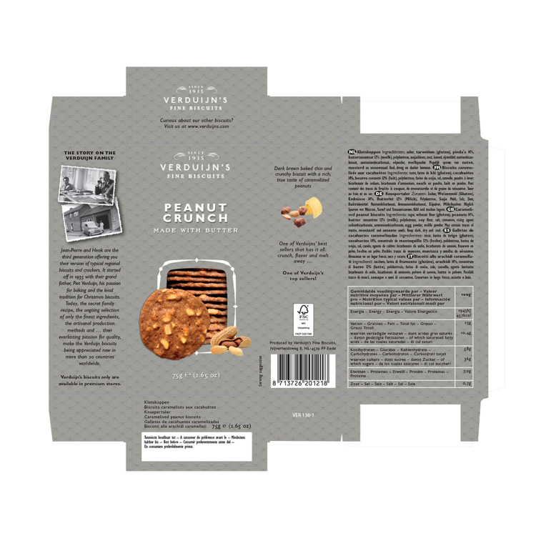 | Ingredient Declaration | Caramelised peanut biscuitsIngredients: sugar, WHEAT flour (GLUTEN), PEANUTS 14%, BUTTER concentrate 12% (MILK), polydextrose, SOY flour, salt, cinnamon, rising agent: sodiumbicarbonate, ammoniumbicarbonate, EGG powder, MILK powder. May contain traces of nuts, mustard and sesame seeds. Keep dark, dry and cool. |