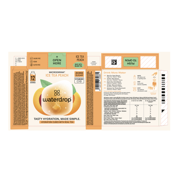 | Ingredient Declaration | Effervescent cube used to create a refreshing drink with the taste of peach from natural flavours with black tea extract, mango extract and mango fruit powder, with sweetener and vitaminsIngredients:acidifier citric acid, black tea extract (7%), acidity regulators: sodium carbonates, potassium cabonates; mango extract, inulin, acidifier malic acid, acidity regulator calcium carbonate, natural flavouring, sweetener sucralose, mango fruit powder, citrus fibre, vitamin C, niacin |