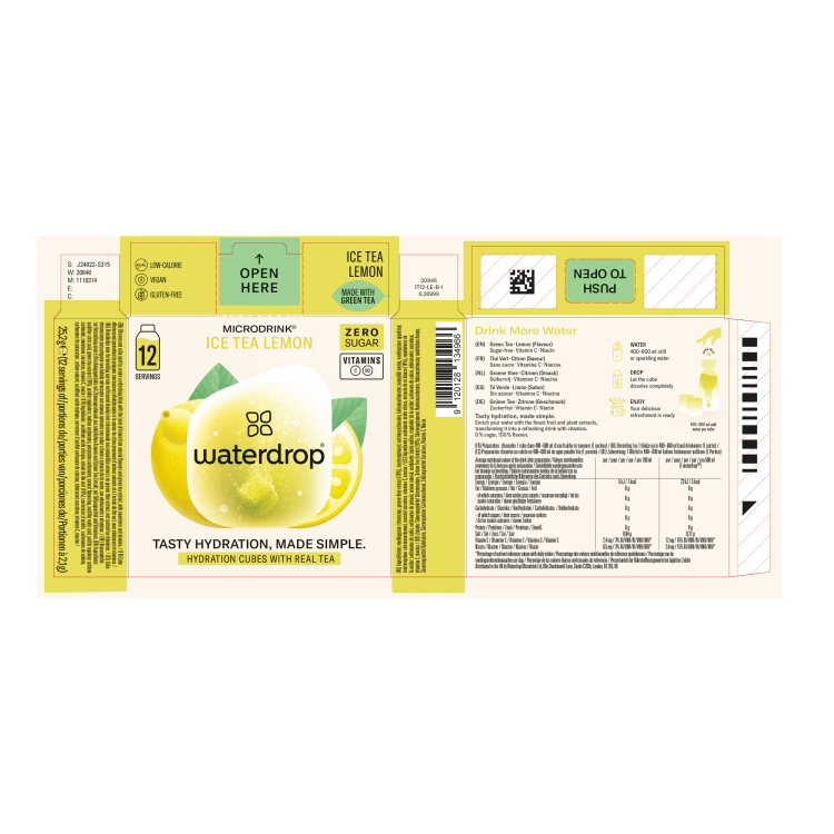 | Ingredient Declaration | Effervescent cube used to create a refreshing drink with the taste of lemon from natural flavours and green tea extract, with sweetener and vitamins.Ingredients:acidifier citric acid, green tea extract (10%), acidity regulators: sodium carbonates, potassium carbonates; natural flavouring, acidifier malic acid, acidity regulator calcium carbonate, sweetener sucralose, vitamin C, niacin |