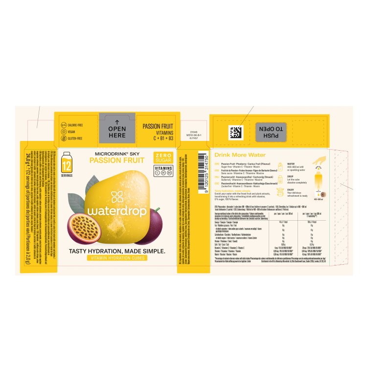 | Ingredient Declaration | Ingredients: acidifier citric acid, natural flavouring, acidity regulators: sodium carbonates, potassium carbonates; acerola powder, cactus fruit extract, acidity regulator magnesium carbonates, sweetener steviol glycosides from stevia, acidity regulator calcium carbonate, niacin, thiamin. Effervescent cube used to create a refreshing drink with the taste of pineberry and passion fruit, as well as cactus fruit extract with sweetener and vitamins. |