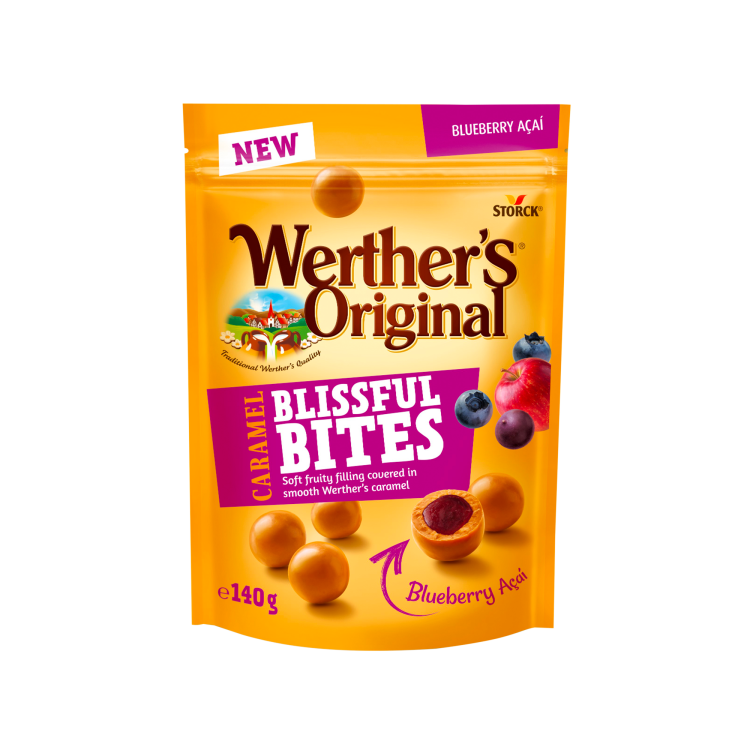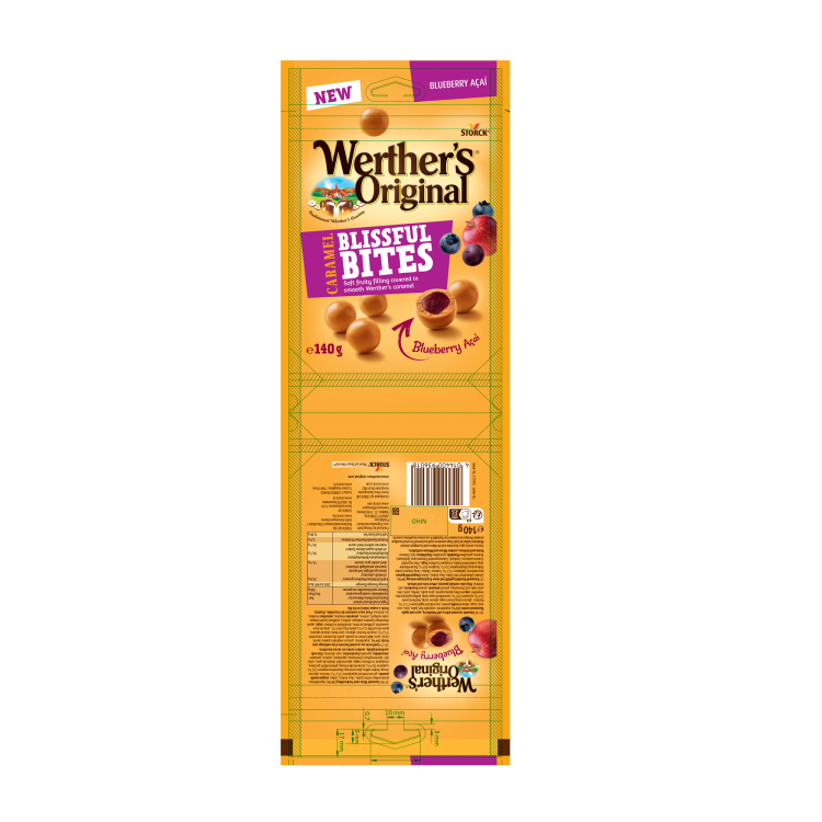 | Ingredient Declaration | vegetable fats (palm, shea, coconut), sugar, skimmed MILK powder, concentrated apple puree (13.2%), fructose glucose syrup, brown sugar, glucose syrup, blueberry puree (2.6%), acai puree (0.9%), caramelised sugar syrup, gelling agent pectins ; emulsifier: SOYA lecithins; glazing agents: gum arabic , shellac; acids: citric acid, malic acid; ground ALMONDS ground HAZELNUTS , salt, dextrose. |