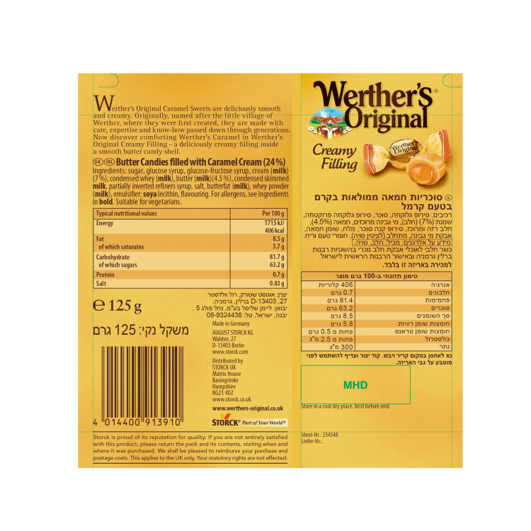 | Ingredient Declaration | Sugar, Glucose Syrup, Glucose fructose syrup, Cream (MILK) 7%, Condensed Whey (MILK), Butter (MILK) 4.5%, condensed skimmed MILK, Partially inverted refiners syrup, Salt, Butterfat (MILK), Whey powder (MILK) Emulsifier: SOYA lecithin, Flavouring. |