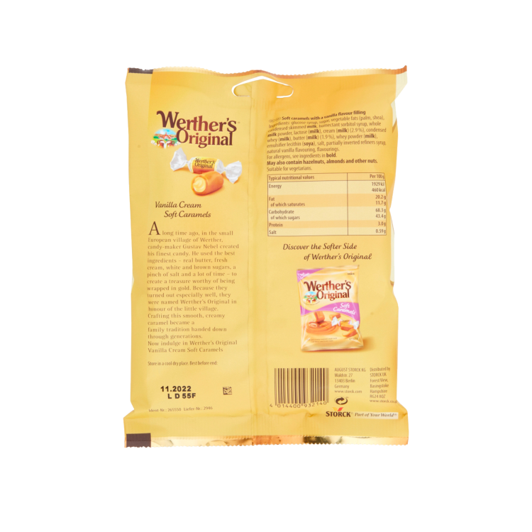 | Ingredient Declaration | Glucose syrup, sugar, vegetable fats (palm, shea), condensed skimmed MILK, humectant sorbitol syrup, whole MILK powder, lactose (MILK), cream (MILK) (2.9%), condensed whey (MILK), butter (MILK) (1.9%), whey powder (MILK), emulsifier lecithin (SOYA), salt, partially inverted refiners syrup, natural vanilla flavouring, flavourings |