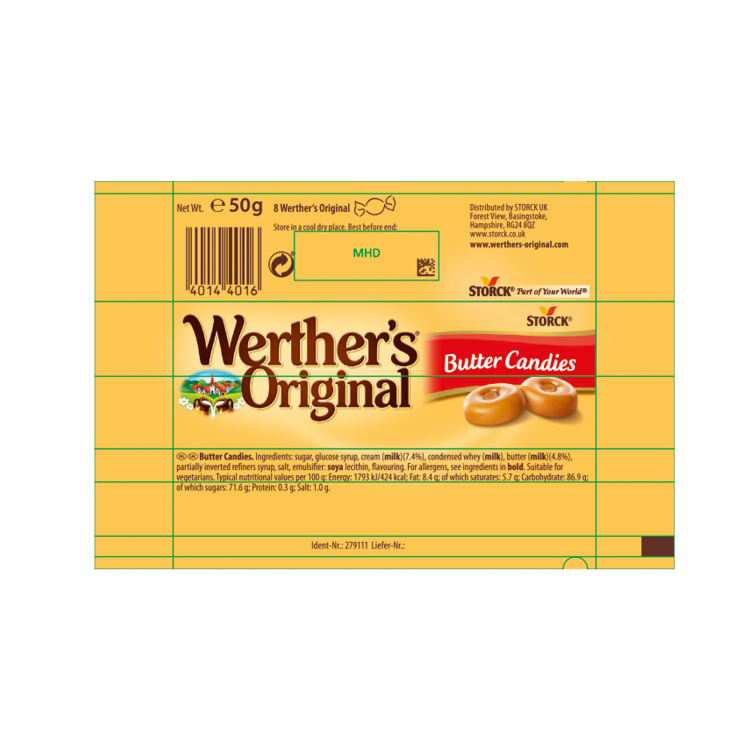 | Ingredient Declaration | Sugar, Glucose Syrup, Cream (MILK) 7.4%, Condensed whey (MILK), Butter (MILK) 4.8%, partially inverted refiners syrup, Salt, Emulsifier: SOYA lecithin, Flavouring. |