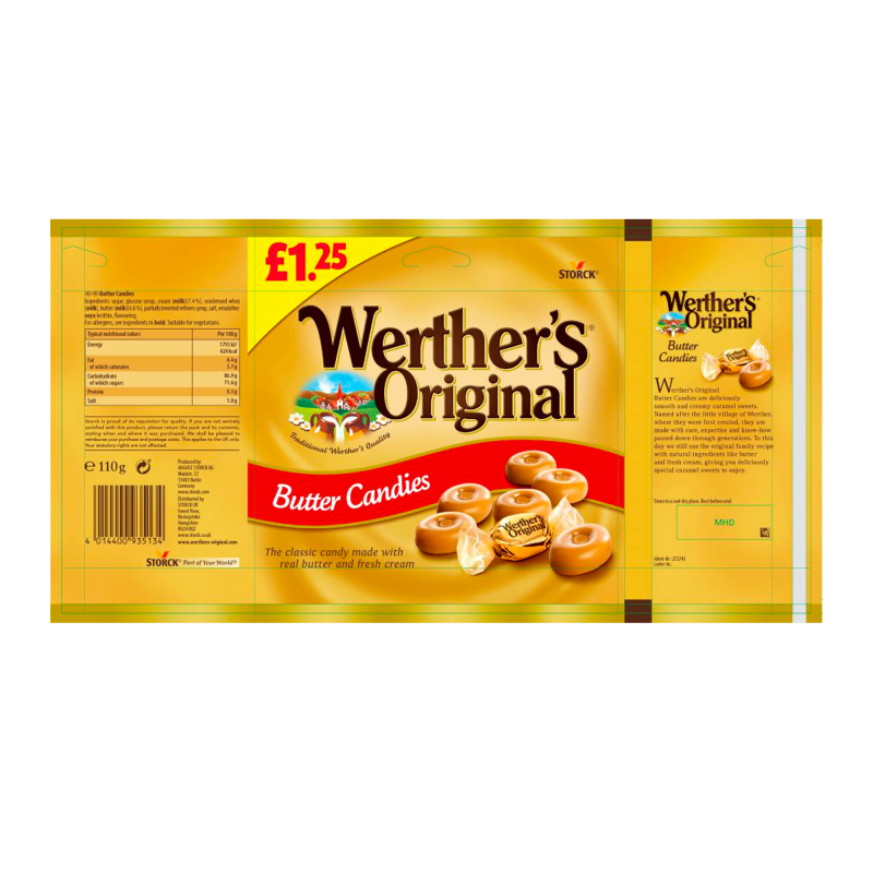 | Ingredient Declaration | Ingredients: Sugar, glucose syrup, cream (MILK)(7.4%), condensed whey (MILK), butter (MILK) (4.8%), partially inverted refiners syrup, salt, emilsifier: SOYA lecithin, flavouring. |