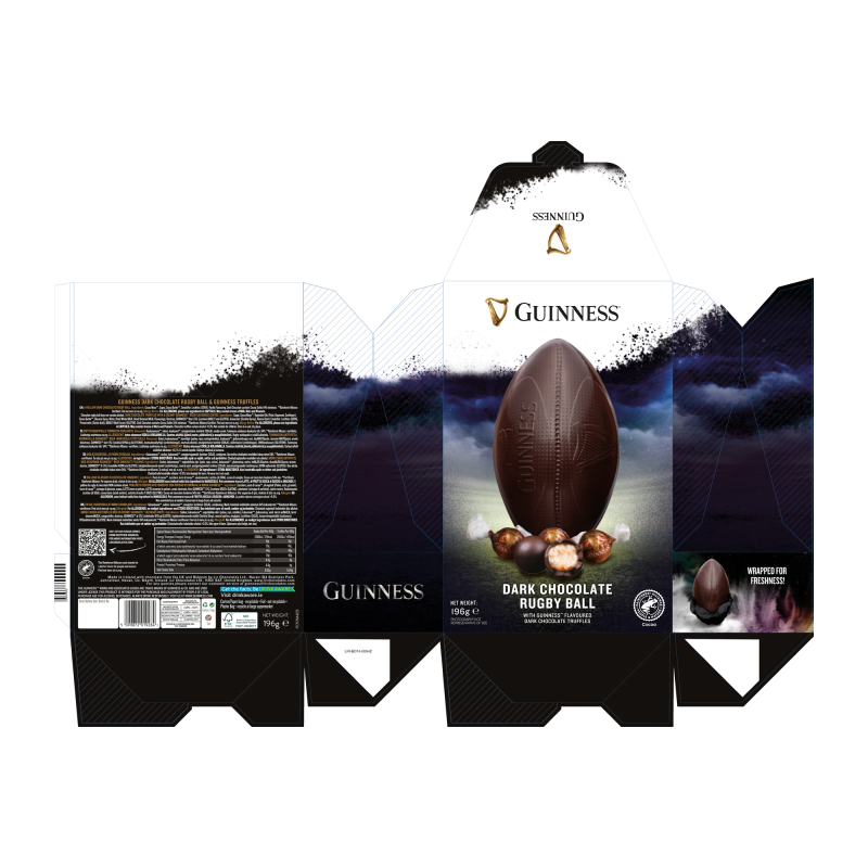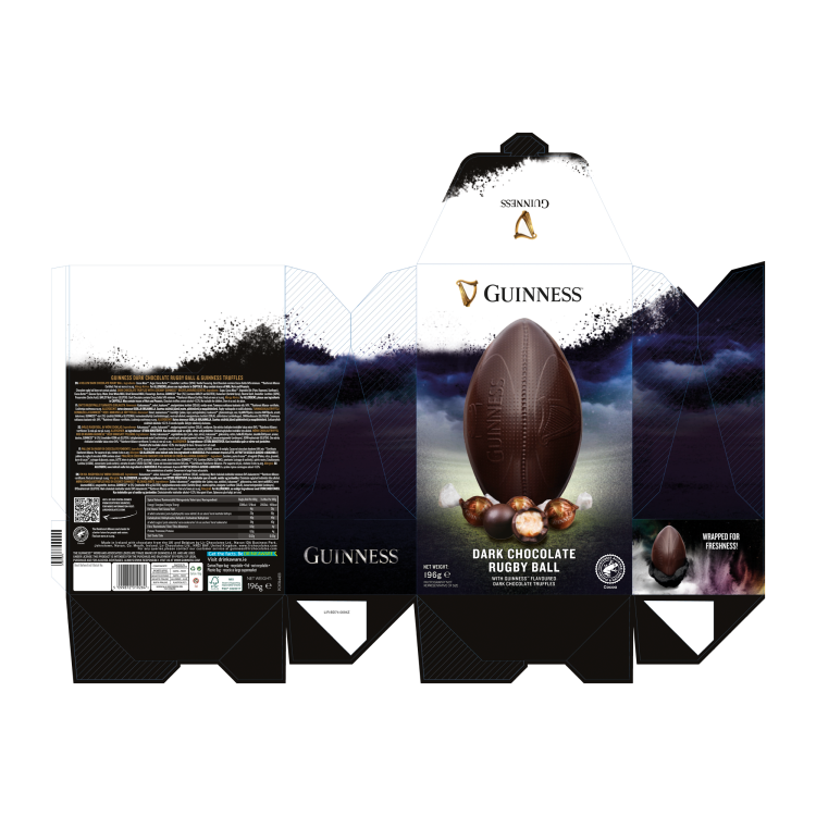 | Ingredient Declaration | A HOLLOW DARK CHOCOLATE RUGBY BALLIngredients: Cocoa Mass, Sugar, Cocoa Butter, Emulsifier: Lecithins (SOYA), Vanilla Flavouring.Dark Chocolate contains Cocoa Solids 64% minimum. DARK CHOCOLATE TRUFFLES WITH A CREAMY GUINNESS™ BEER FLAVOURED CENTREIngredients: Sugar, Cocoa Mass, Vegetable Oils (Palm, Rapeseed, Sunflower), Cocoa Butter, Glucose Syrup, Water, Dried Whole MILK, Dried Skimmed MILK, Flavourings, Dextrose, GUINNESS™ Beer (1%) (contains BARLEY and GLUTEN), Humectant (Sorbitol Syrup), Neutral Spirit, Emulsifier: Lecithins (SOYA), Preservative (Sorbic Acid), BARLEY Malt Extract (GLUTEN).Dark Chocolate contains Cocoa Solids 54% minimum. |