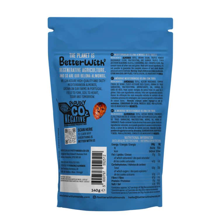 | Ingredient Declaration | Almonds (93%), Brown Sugar, Truffle Powder(Buckwheat Flour, Maltodextrin, Dry Summer Truffle (TuberAestivum) Seasoning (0,04%), Flavouring), Salt, Chickpea Flour. |