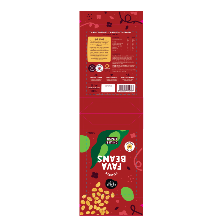 | Punchy chilli and zesty lemon meet beautiful British fava beans in this 120g sharing bag. These fava beans are roasted to perfection then seasoned generously. No bags of blandness here. Some say ‘it’s like a crisp and a nut have had a baby’, others say ‘how did I not discover fava beans before?’ and some are just left completely speechless. Great as a snack with a glass of something cold. |
