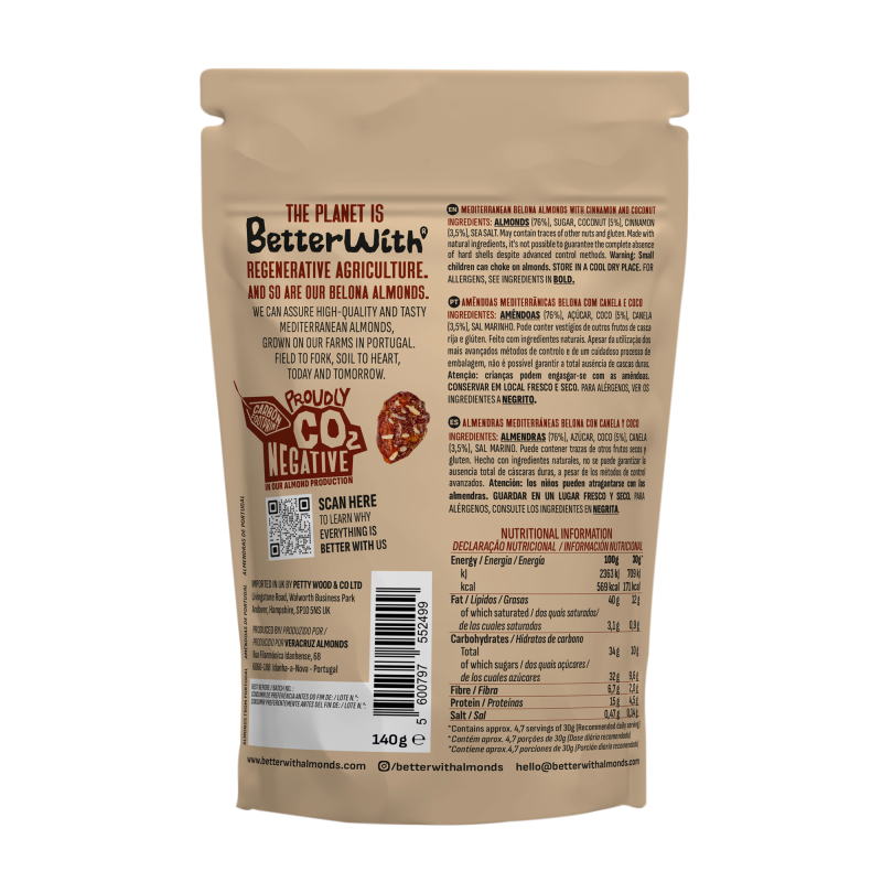 Ingredient Declaration | Almonds (76%), sugar (14,5%), coconut (5%), cinnamon (3,5%) and sea salt (1%) |
