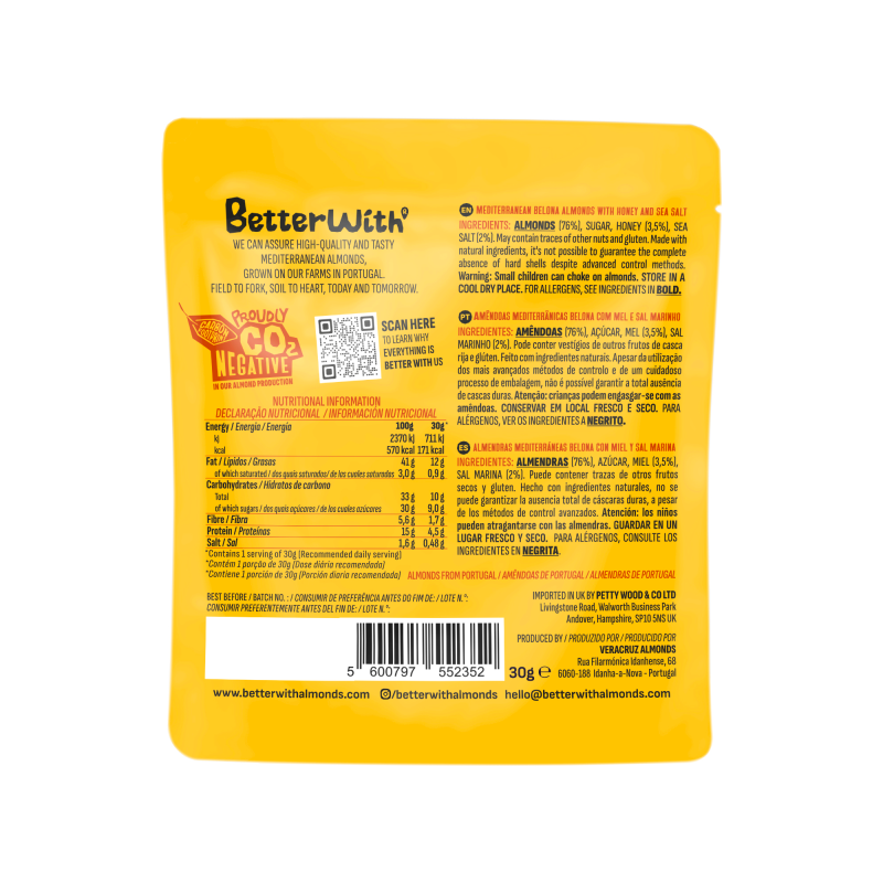 Ingredient Declaration | Almonds (76%), sugar (18,5%), honey (3,5%) and salt (2%) |