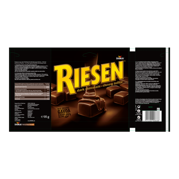 | Dark chocolate on the outside, rich chocolate caramel on the inside – a particularly long-lasting chewy treat. The inimitable, intensively chocolatey taste is due to the special blend of selected Gavoa cocoa beans. |