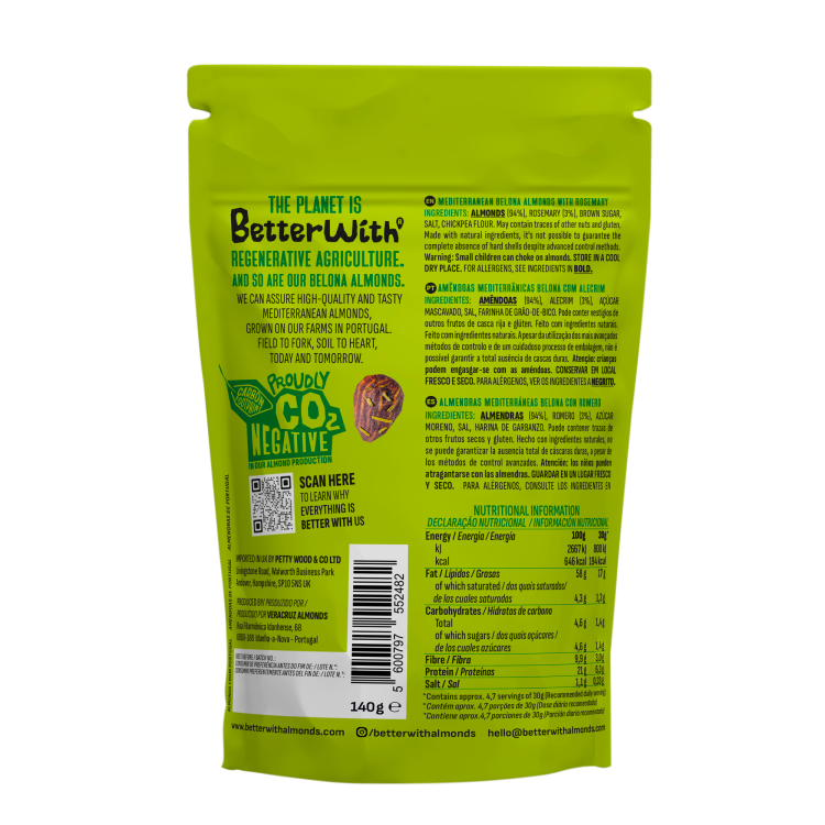 | Rosemary and Sea Salt flavoured almonds are natural, gluten-free, crunchy and versatile. This version of Better With almonds adds a unique and authentic flavour to your snacks, with a distinctive finishing touch of rosemary. |