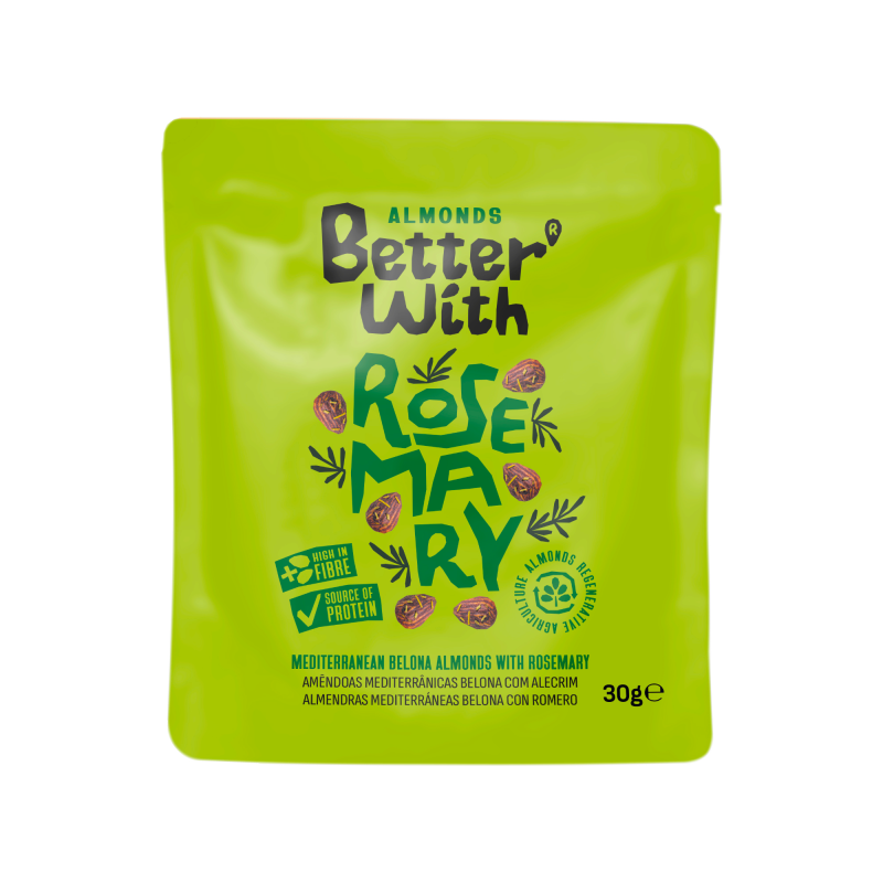 Ingredient Declaration | Almonds (93,5%), rosemary (3%), brown sugar (2,55%), salt (0,85%) and chickpea flour (0,1%) |