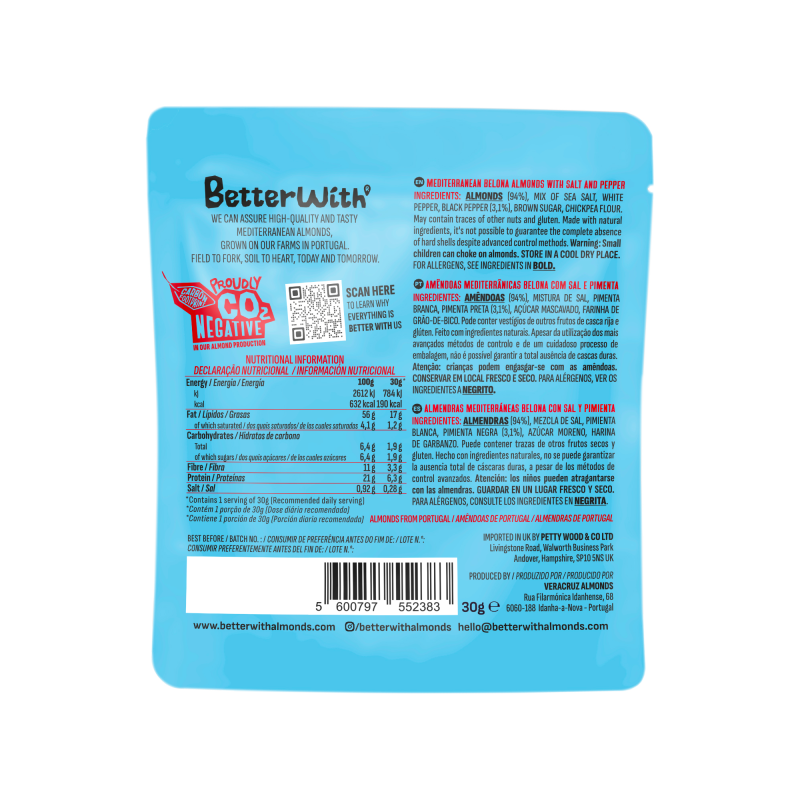 Ingredient Declaration | Almonds (94%), white pepper and black pepper, sea salt (3,1%), brown sugar (2,8%), chickpea flour (0,1%) |