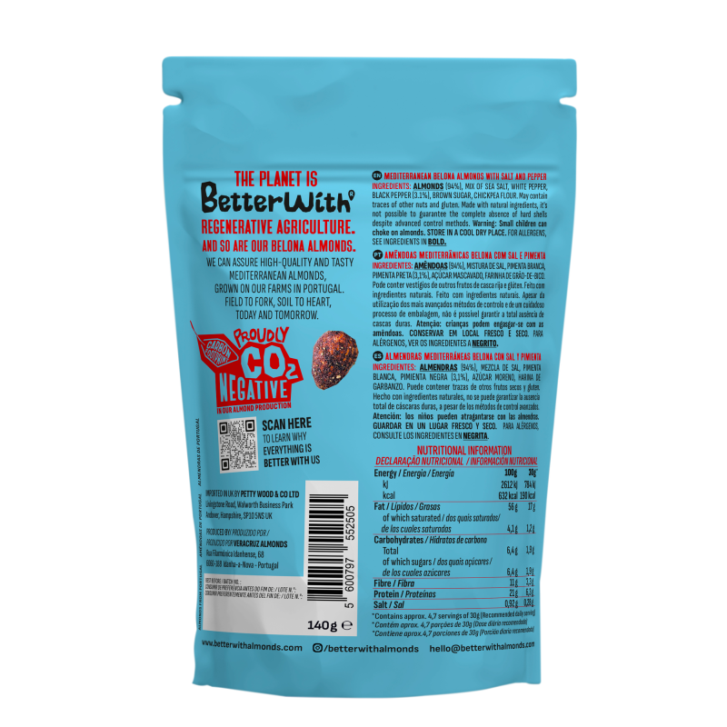 Ingredient Declaration | Almonds (94%), white pepper and black pepper, sea salt (3,1%), brown sugar (2,8%), chickpea flour (0,1%) |